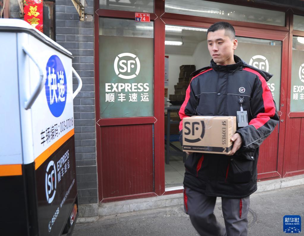 顺丰北京石头胡同营业站“快递小哥”刘阔在整理包裹(2019年2月1日摄)。新华社记者李德欣摄
